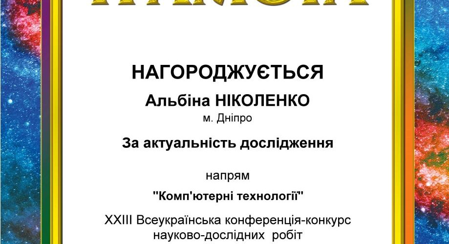 Ніколенко Альбіна, група Е-23, представила дослідження на тему: «Вплив космічних технологій на світову економіку: моделювання макроекономічних ефектів», за що отримала грамоту за актуальність дослідження та сертифікат учасника!